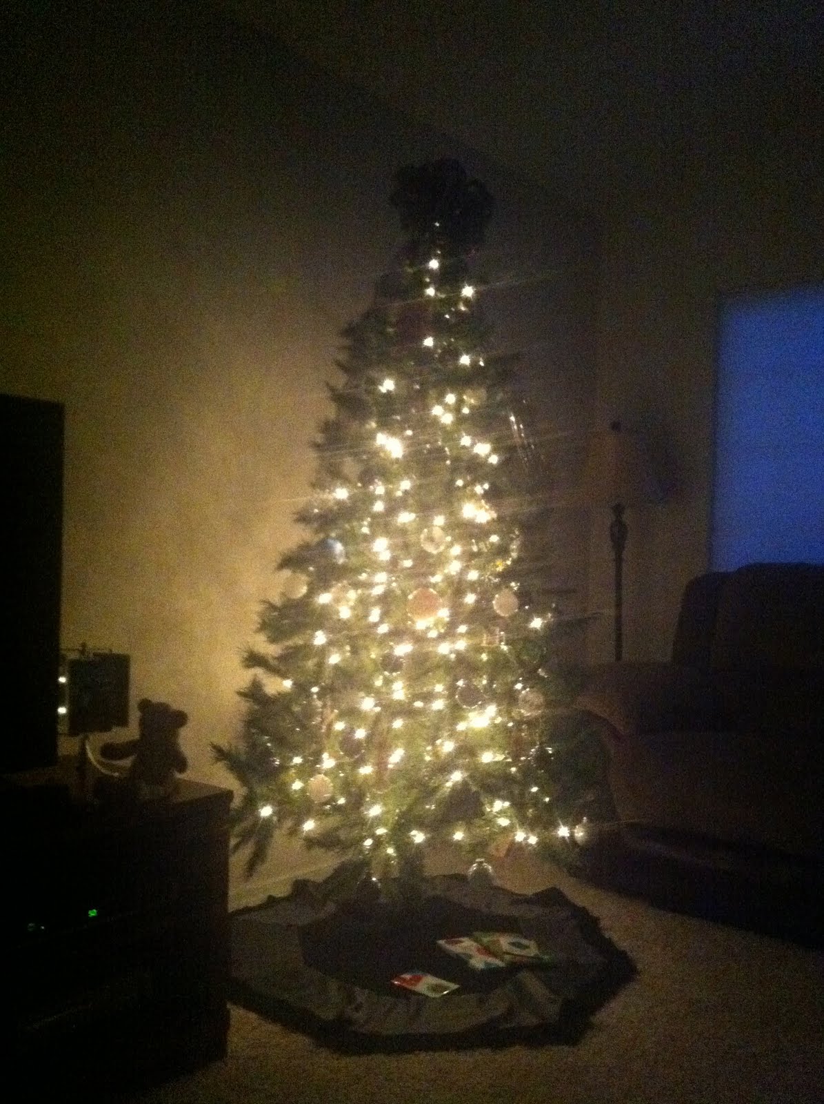 And here it is all lit & sparkly in the dark (at 4 in the afternoon)! I am absolutely in LOVE with the tree and am anxious to see what the hub thinks when he sees it!